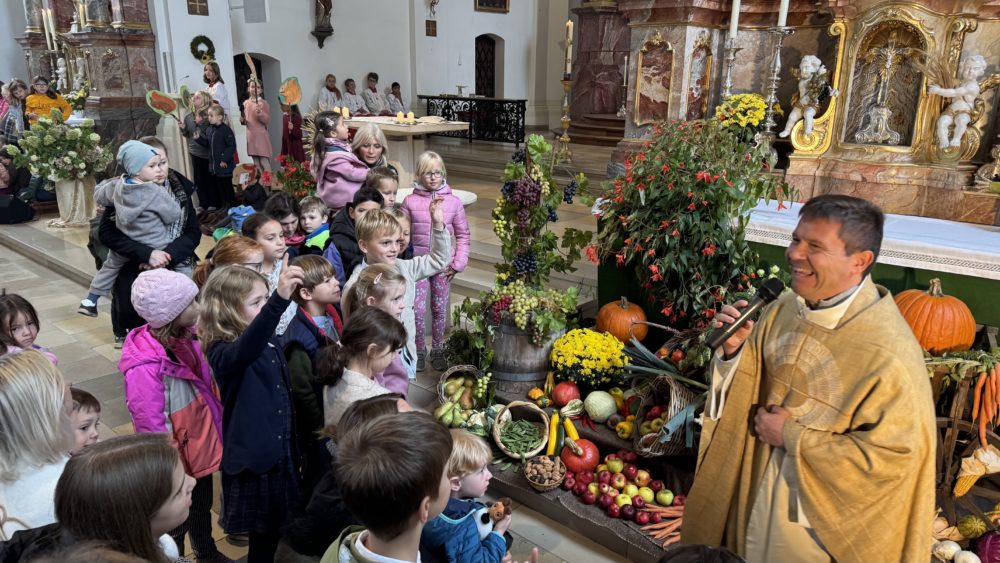 Den Zusammenhang zu uns Menschen stellte Pfarrer Peter Seidel dann her und lud die Kinder ein, den Erntedankaltar zu betrachten und fragte, was sie dort alles entdecken können. Es wurde deutlich: Erntedank ist ein Fest des Staunens über die Vielfalt der Natur und der Dankbarkeit für Gottes Schöpfung. Es gibt viele Formen der Dankbarkeit, die wir an diesem Tag ebenfalls bedenken wollen. Dankbar können wir dafür sein, dass wir gesund sind, dass wir Freunde haben, dass wir zur Schule gehen dürfen, Arbeit haben und an diesem schönen Ort wohnen.