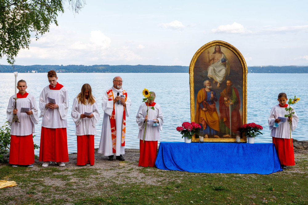 Die alte Kirche St. Peter und Paul steht am 29. Juni immer im Mittelpunkt, denn das Patrozinium feiert Pfarrer Peter Paul Brummer sehr gerne. Mit einem Alten Bild der Apostel Petrus und Paulus aus der St. Joseph Kirche, das am See aufgestellt wurde, erfuhren die Gläubigen viel über die beiden Apostel, denn sie waren beide in enger Verbindung mit Jesus und erlebten Höhen und Tiefen mit ihm und mit sich selbst. Im Laufe der Predigt bildete sich dann auf dem See auch noch ein Regenbogen und trug so dazu bei, dass es ein unvergesslicher Gottesdienst wurde. Die Haunshofener Bläser untermalten den Gottesdienst musikalisch, der seinen Abschluss in der alten Kirche fand, die im vergangenen Jahr renoviert wurde und jetzt wieder strahlend erblüht ist.